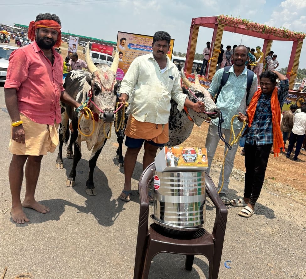 கோயம்புத்தூரில் மாவட்ட நிர்வாகம் தமிழர் பண்பாட்டு ஜல்லிக்கட்டு பேரவை ஆகியவை சார்பில் கோவையை அடுத்த செட்டிபாளையம் எல் அண்ட் டி பைபாஸ் ரோடு அருகே நடைபெற்ற ஜல்லிக்கட்டு போட்டியில் கலந்து கொண்ட தேனி மாவட்டம் கம்பம் புதுப்பட்டி பாஜக கவுன்சிலர் பிரதீபா ரெங்கபாபுவின் வீரா காளைகள் பங்கேற்று விழாவில் பங்கேற்ற 800 காளைகளில் ஜல்லிக்கட்டு விழாவில் காளையை பாராட்டி மாவட்ட நிர்வாகம் மற்றும் தமிழர் பண்பாட்டு ஜல்லிக்கட்டு பேரவை சார்பில் வீரா காளையின் உரிமையாளர் ரெங்க பாபு அவர்களுக்கு பல்வேறு பரிசுகள் வழங்கி பாராட்டினார்கள்