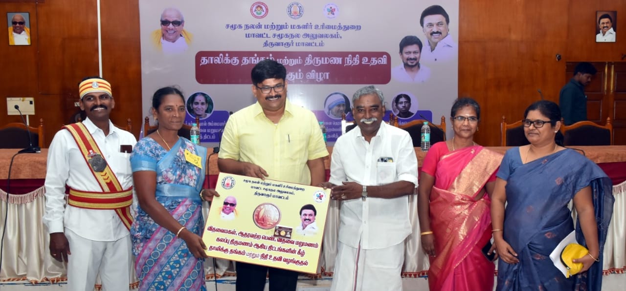 தமிழ்நாடு அரசு சமூகநலன் மற்றும் மகளிர் உரிமைத்துறையின் வாயிலாக ஈ.வெ.ரா. மணியம்மையார் நினைவு விதவை மகள் திருமண நிதியுதவி திட்டம் அன்னை தெரசா நினைவு ஆதரவற்ற பெண் திருமண நிதியுதவித்திட்டம் டாக்டர்.முத்துலெட்சுமி ரெட்டி நினைவு கலப்பு திருமண நிதியுதவி திட்டம் ஆகிய திட்டங்களின்கீழ் 50 பயனாளிகளுக்கு ரூ.69 இலட்சத்து 45 ஆயிரம் மதிப்பிலான திருமண நிதியுதவியுடன் கூடிய தலா 8 கிராம் தங்க நாணயங்களை மாவட்ட ஆட்சியர் வ.மோகனச்சந்திரன் திருவாரூர் சட்டமன்ற உறுப்பினர் பூண்டி.கே. கலைவாணன் வழங்கினார்கள்.