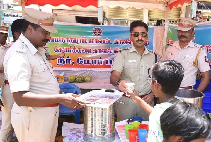 நீர்மோர்பந்தல் திறப்புவிழா இராமநாதபுரம் மாவட்டம் ராமநாதபுரம் பாரதி நகர் பேருந்து நிறுத்தம் அருகே, கோடை வெயிலில் மக்களின் தாகத்தை தீர்க்க இராமநாதபுரம் மாவட்ட காவல்துறை சார்பில் அமைக்கப்பட்ட நீர் மோர் பந்தலை மாவட்ட காவல் கண்காணிப்பாளர் G.சந்தீஷ். அவர்கள் திறந்துவைத்து பொதுமக்களுக்கு நீர் மோர் வழங்கினார்உடன் காவல் துறையினர்
