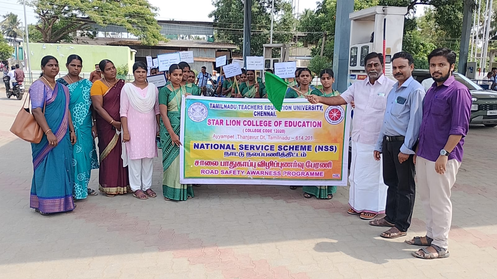 தஞ்சாவூர் மாவட்டம் பாபநாசம் அருகே சூலமங்கத்தில் ஸ்டார் லயன் கல்வியியல் கல்லூரி நாட்டு நலப்பணி திட்டம் சார்பில் சாலை விழிப்புணர்வு பேரணி கல்லூரி தாளாளர் கலியமூர்த்தி தலைமையில் நடைப்பெற்றது.