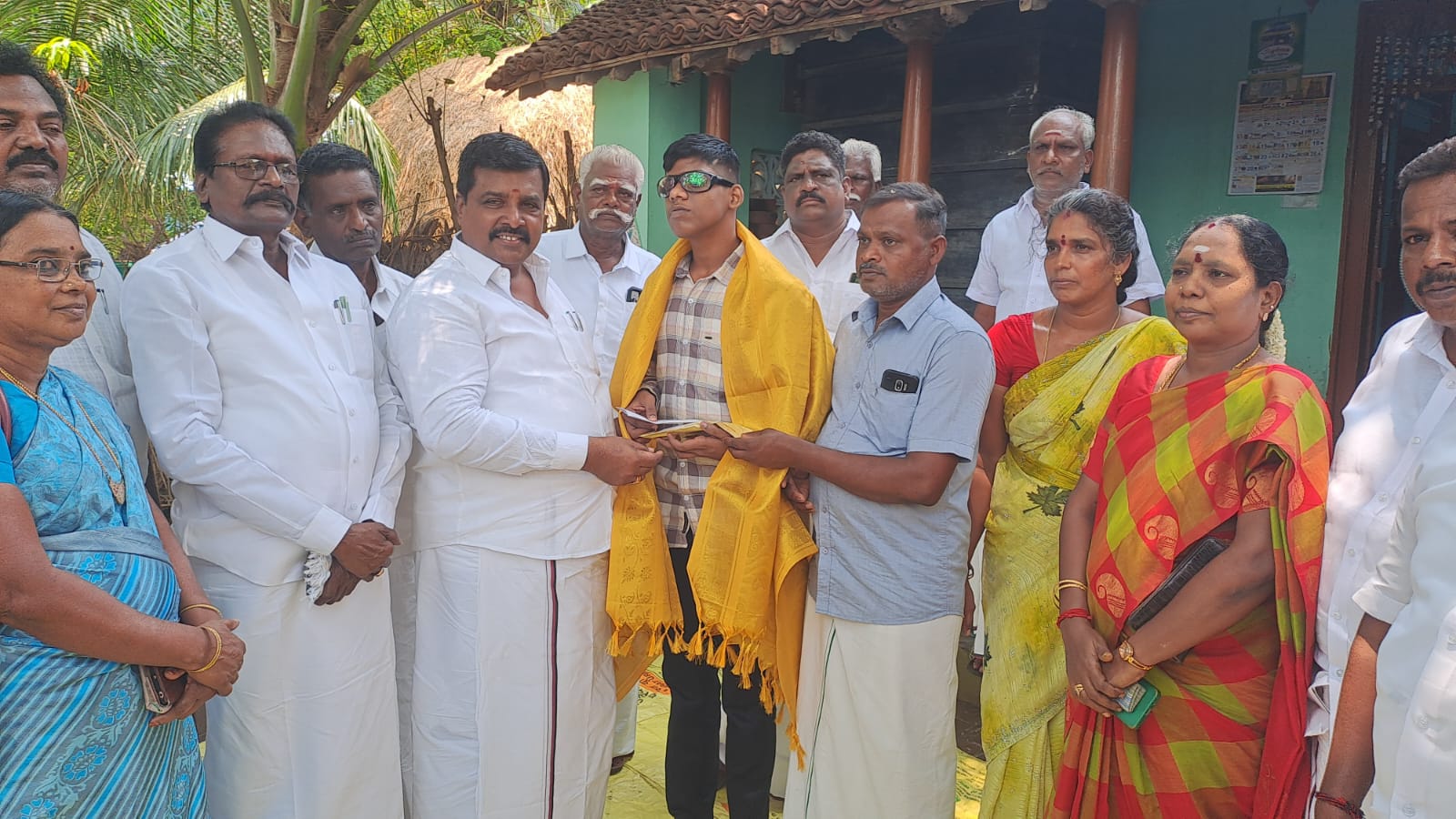 தமிழகத்திலேயே முதல் மதிப்பெண் பெற்று பார்வை குறைபாடு உடைய மாணவன் சாதனை. மாவட்டச் செயலாளரும் பூம்புகார் சட்டமன்ற உறுப்பினருமான நிவேதா எம் முருகன் நேரில் சென்று வாழ்த்தி உதவித்தொகை வழங்கினார்