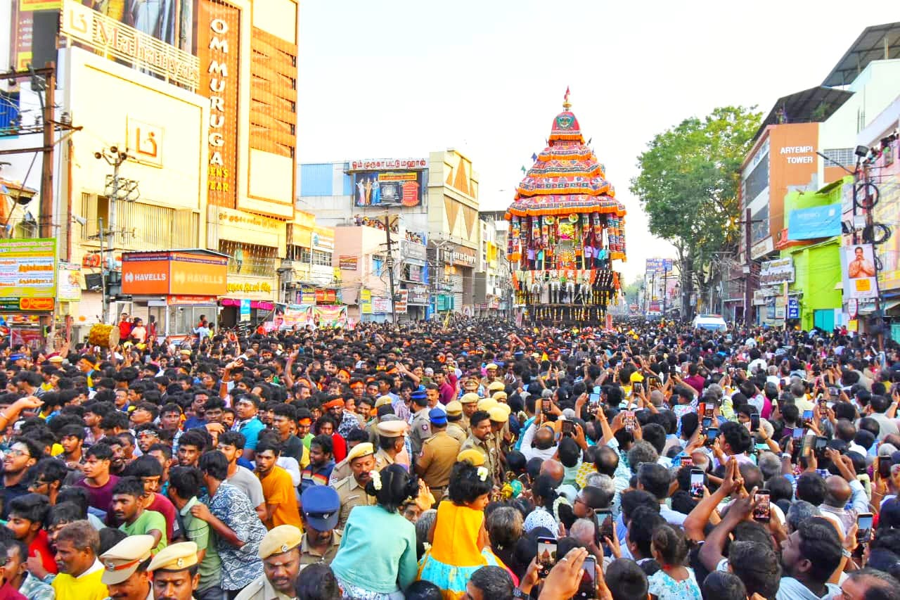 சுவாமி அம்மன் திருத்தே ருக்கு முன்பாக அலங்கரிக் கப்பட்ட யானை முன்னே செல்லும்போது அவற்றை தொடர்ந்து முதலில் விதாய கரும் இரண்டாவதாக முருகப்பெருமானும், தொடர்ந்து நாயன்மார்களும் அமர்ந்தி ருந்த சப்பரங்கள்சென்றது. சுவாமி, அம்மனின் திருத்தேரானது மதுரைநகர வீதிக னான கீழமாசி வீதி, தெற்கு மாசி வீதி. மேலமாசி வீதி, வடக்குமாசி வீதிகளில் வலம் வந்து பின்னர் மதியம் கீழமாசி வீதியில் உள்ள தேரடியை வந்தடைந்தது.