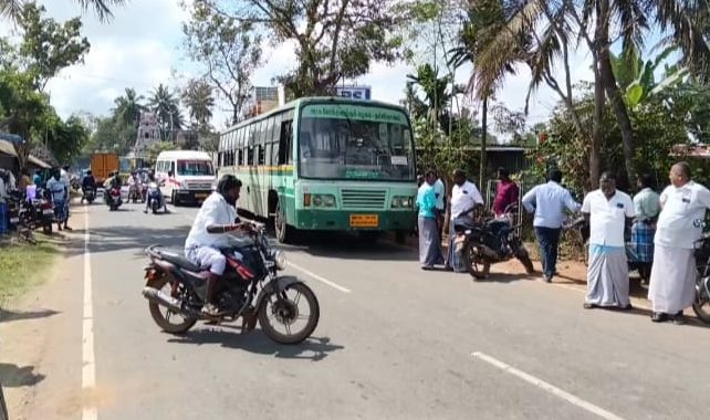 திருவாரூர் அருகே சாத்தங்குடி கிராமத்தை சேர்ந்தவர் சண்முகம் 61 இவர் இன்று காலை தனது மாட்டை ஓட்டி மேய்ச்சலுக்காக சாலையை கடந்த போது திருத்துறைப்பண்டியில் இருந்து திருவாரூர் நோக்கி சென்ற அரசு பேருந்து மோதி சண்முகம் உடல் நசுங்கி சம்பவ இடத்திலேயே உயிரிழந்தார்.