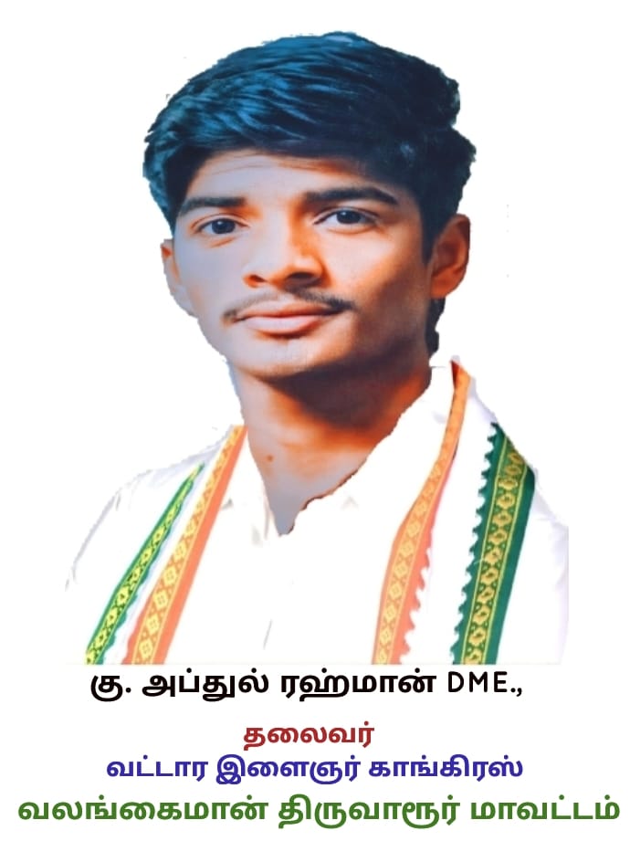 திருவாரூர் மாவட்டம் வலங்கைமான் வட்டார தமிழ்நாடு இந்திய தேசிய காங்கிரஸ் கட்சியின் இளைஞர் அணி தேர்தல் நடைபெற்றது. அதில் வலங்கைமான் வட்டார இளைஞர் காங்கிரஸ் தலைவராக வலங்கைமான் கு. அப்துல் ரஹ்மான் DME., அதிக வாக்குகள் பெற்று வெற்றி பெற்றார்.
