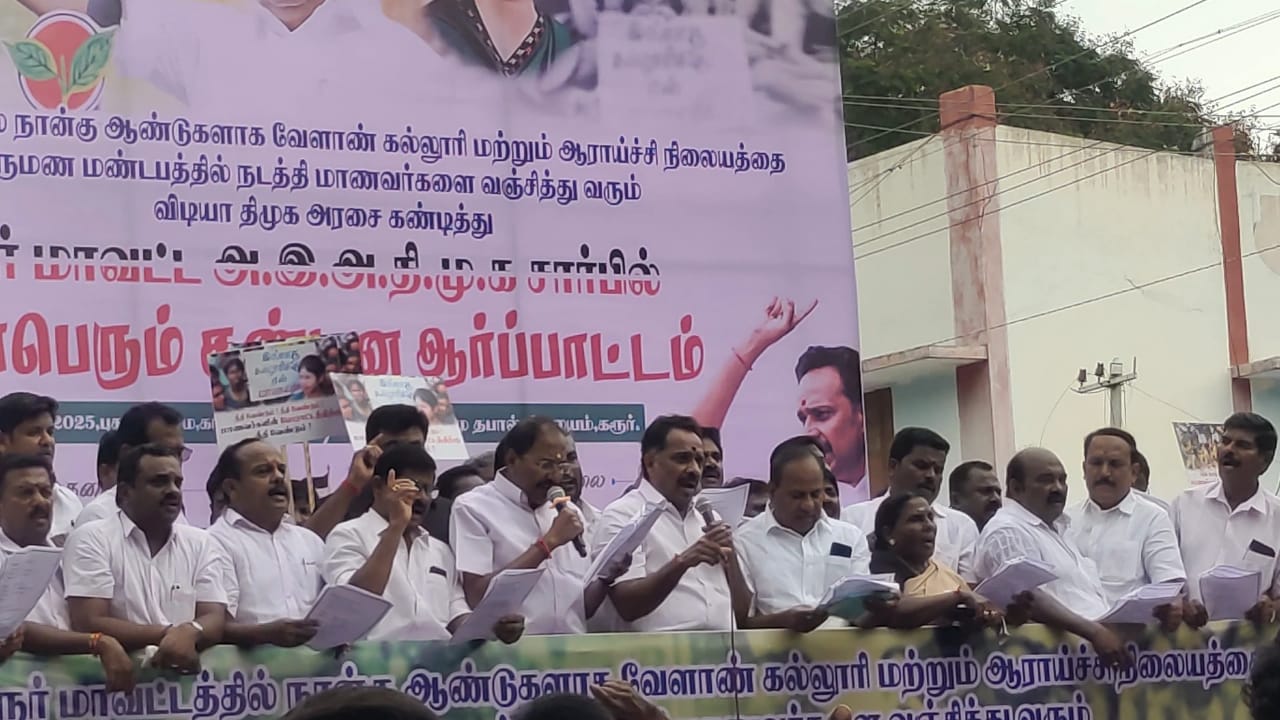 இந்த நான்கு ஆண்டுகளில் திமுக ஆட்சி மக்களின் எந்த ஒரு திட்டங்களும் நிறைவேற்றப்படாமல் மட்டுமே உள்ளது. 512 வாக்குறுதிகளை வழங்கிய திமுக அரசு எந்த ஒரு நடைமுறையும் இல்லாமல் கண்துடைப்புக்கு மட்டுமே கொடுக்கப்பட்ட வாக்குறுதிகள் விவசாய வேளாண்மை கல்லூரி மாணவ, மாணவிகள் இறுதி ஆண்டு முடியும் நிலையில் கல்லூரி இல்லாத ஒரு நிலை என மாபெரும் கண்டன கோஷங்களை ஏராளமானத்திற்கும் மேற்பட்ட அதிமுக தொண்டர்கள் கண்டன ஆர்ப்பாட்டத்தில்