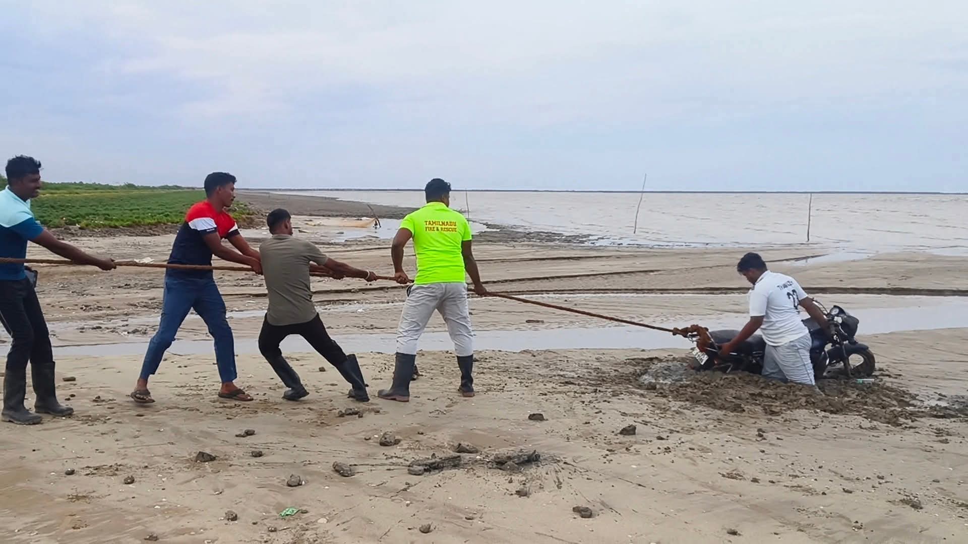 நாகை மாவட்டம் வேதாரண்யம் வட்டம் வேதாரண்யம் கடற்கரை ஈர மண்ணில் இளைஞர் வண்டி ஓட்டும் போது திடீரென சேற்றில் வண்டியும் அவரும் சிக்கி உள்ளனர்