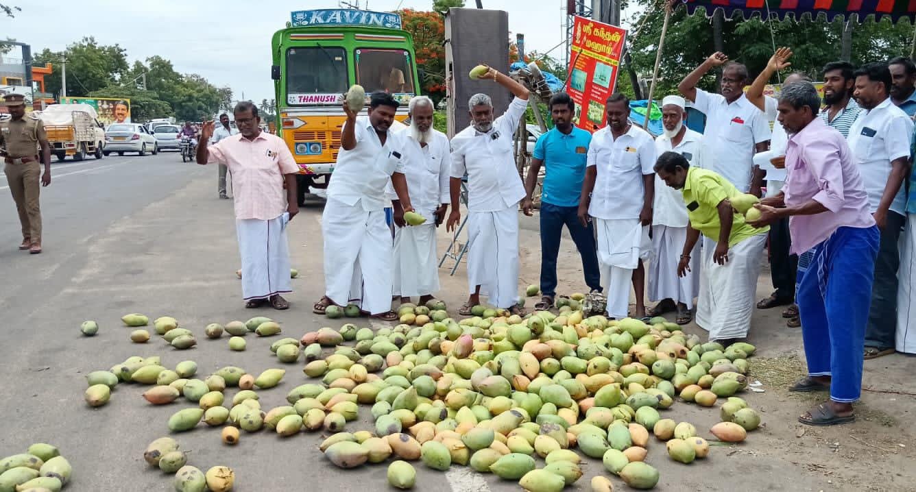 திண்டுக்கல் மாவட்டம் பழனியை அடுத்த ஆயக்குடியில் மாம்பழங்களின் விலை கடும் வீழ்ச்சி அடைந்ததால் ஏக்கர் ஒன்றுக்கு ஒரு லட்சம் ரூபாய் நிவாரணம் வழங்க கோரி மாம்பழங்களை சாலையில் கொட்டி விவசாயிகள் போராட்டம் நடைபெற்றது