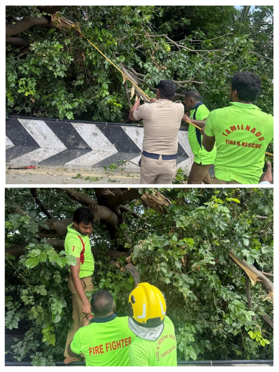 தகவல் அறிந்த, திருவொற்றியூர் மண்டல குழு தலைவர் தனியரசு சம்பவ இடத்தில் முகாமிட்டு, தீயணைப்பு துறையினருக்கு தகவல் கொடுத்தார். அதன் அடிப்படையில், திருவொற்றியூர் தீயணைப்பு வீரர்கள் சம்பவ இடத்திற்கு விரைந்து வந்து, மரம் வெட்டும் இயந்திரங்களை பயன்படுத்தி, மரக்கிளைகளை அகற்றினர். பின் போக்குவரத்து சீரானது.