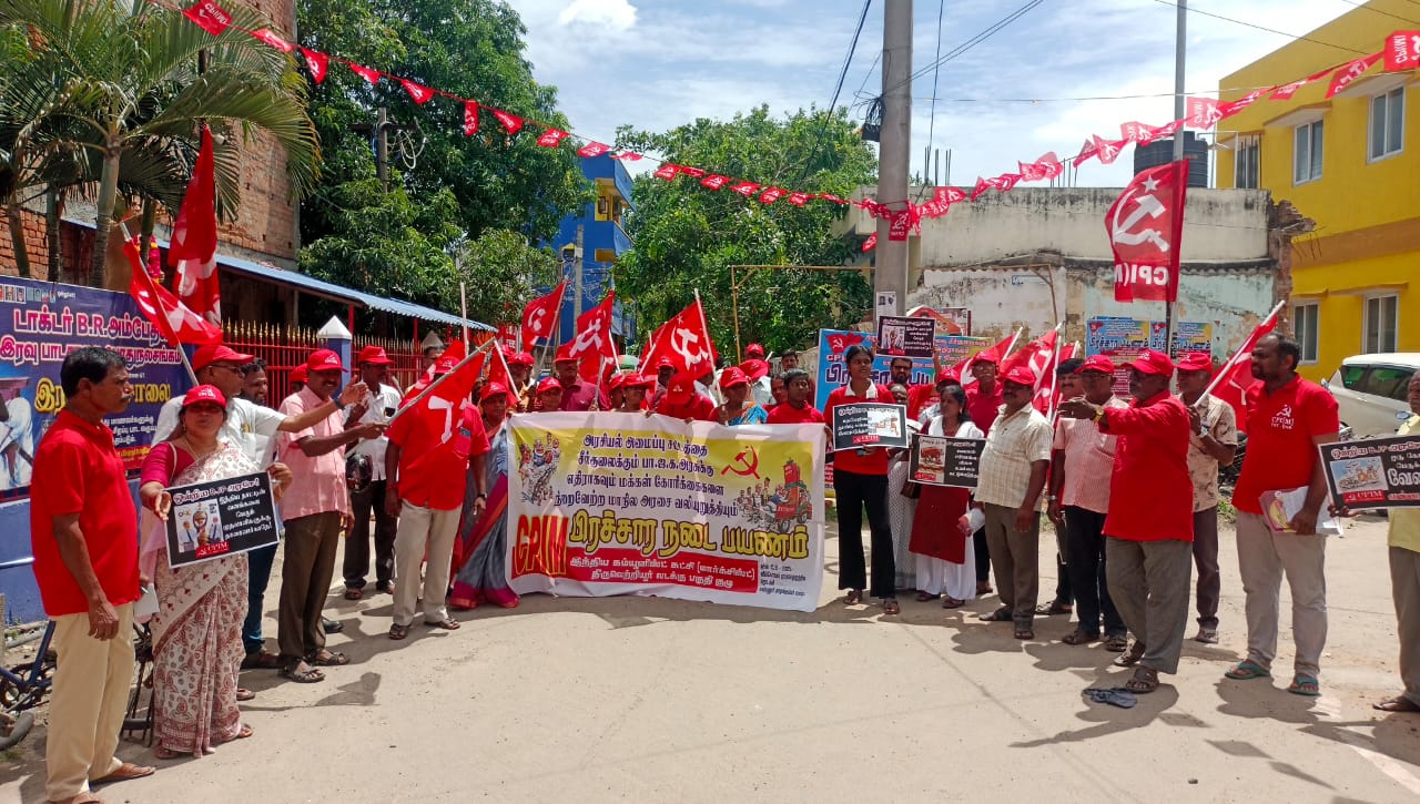 திருவெற்றியூர் சென்னை வடக்கு மார்க்சிஸ்ட் கம்யூனிஸ்ட் கட்சி பகுதி குழு சார்பில் ராமநாதபுரத்தில் பகுதிக்குள் உறுப்பினர் அலமேலு தலைமையில் மக்கள் சந்திப்பு நடப்பயணம் முன்பாக டாக்டர் அம்பேத்கர் உறவு சிலைக்கு மாலை அணிவித்து சி பி ஐ எம் மாநில குழு உறுப்பினர் எல் சுந்தரராஜன் கொடி அசந்தி நடைப்பயணத்தை துவக்கி வைத்தார்