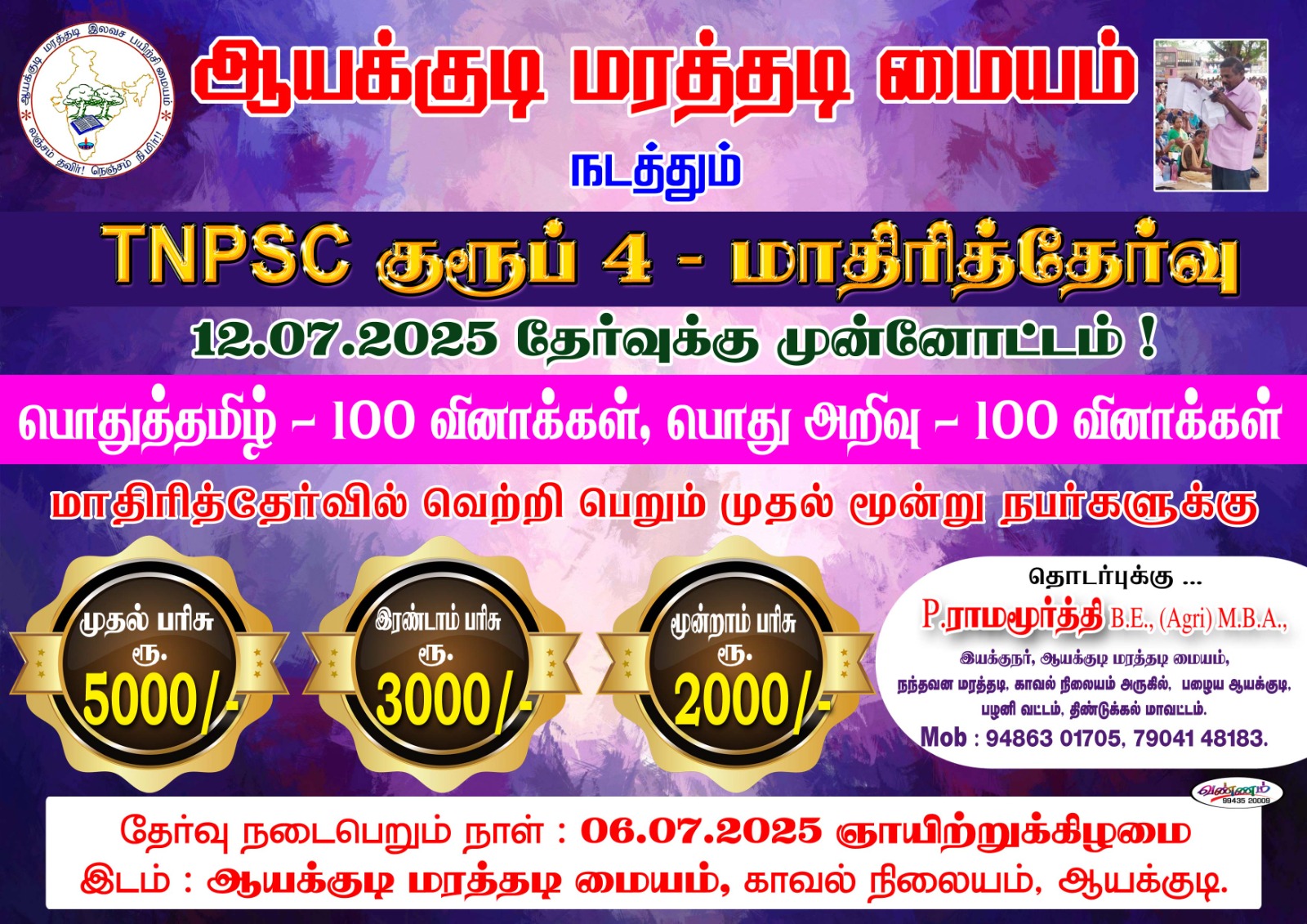 தமிழ்நாடு அரசுபணியாளர் தேர்வாணையம் வருகிற 12/7/2025 அன்று குரூப்4 தேர்வினை நடத்துகிறது.இந்த தேர்வு 10 ம்வகுப்பு தேர்ச்சியை அடிப்படையாக கொண்ட தேர்வு என்பதால் 20 லட்சம் பேர் எழுத வாய்ப்பு உண்டு! போட்டி மிக கடுமையாக இருக்கும் என தெரிகிறது.இந்த தேர்வுக்கு முன்னோட்டமாக ஆயக்குடி மரத்தடி மையம் 6/7/2025 அன்று மாதிரித்தேர்வினை நடத்துகிறது.