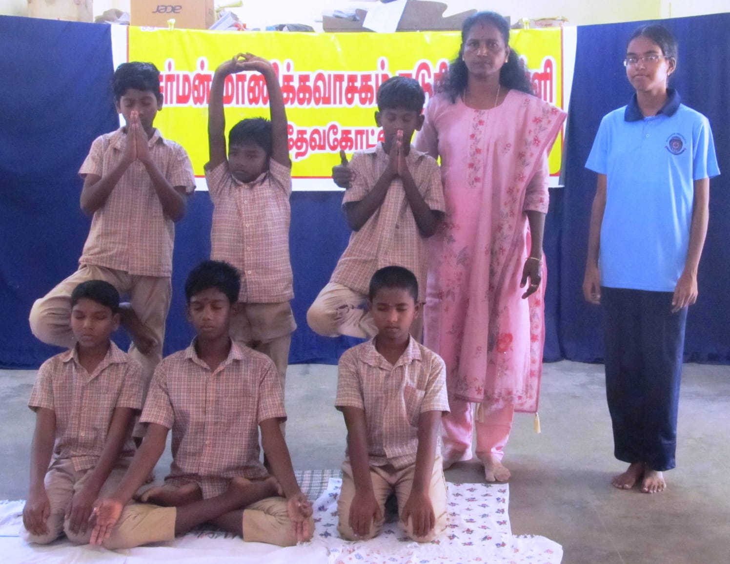 ஆசிரியை முத்துலெட்சுமி வரவேற்றார்.தலைமை ஆசிரியர் லெ .சொக்கலிங்கம் தலைமை தாங்கினார். காரைக்குடி அழகப்பா பல்கலைக்கழக யோகா துறை தலைவரும், பேராசிரியருமான சரோஜா மாணவர்களுக்கு ஆசனங்கள் கற்றுக்கொடுத்து பேசுகையில் , உடலும் ,மனமும் சேர்ந்து புத்துணர்வுடன் இருந்தால்தான் நாம் நன்றாக இருக்க முடியும்.அதற்கு அனைவரும் இளம் வயது முதலே யோகாவை கற்றுக்கொண்டு தினமும் யோகா செய்ய வேண்டும். யோகாவை உங்கள் வாழ்க்கையின் ஒரு பகுதியாக மாற்றி கொள்ளுங்கள்.இவ்வாறு பேசினார்.