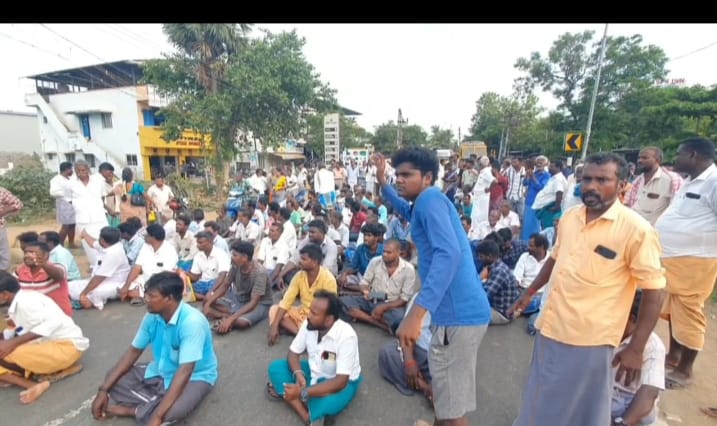 திருவாரூரில் அரசு ஒழுங்குமுறை விற்பனை கூடத்தில் பருத்தி குறைந்த விலைக்கு எடுப்பதாக கூறி விவசாயிகள் 200க்கும் மேற்பட்டோர் சாலை மறியல் போராட்டம் .
